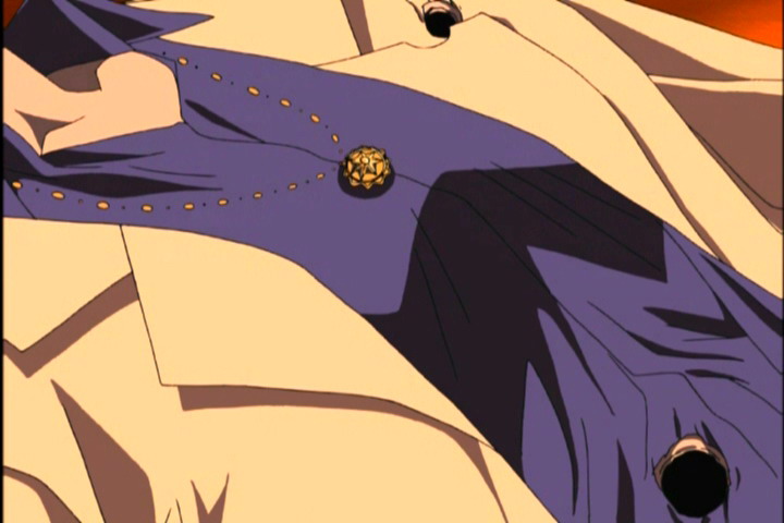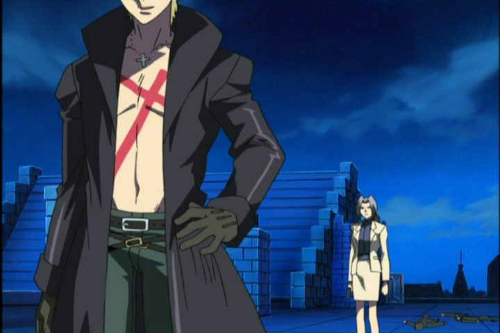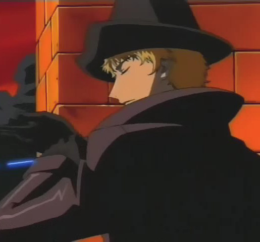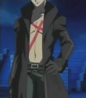 Ёдзи: Чёрный плащ на голое тело, зеленые брюки, ремень на поясе, два перекрещивающихся ремня на бёдрах, чёрные ботинки, чёрные перчатки, чёрная ковбойская шляпа. На груди наискосок нарисован красный крест, на шее висит крестик на цепочке. Весь в крестах, голова в кустах в шляпе :)