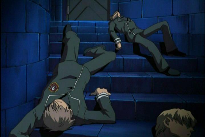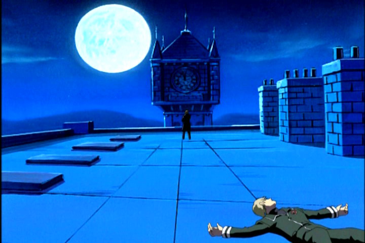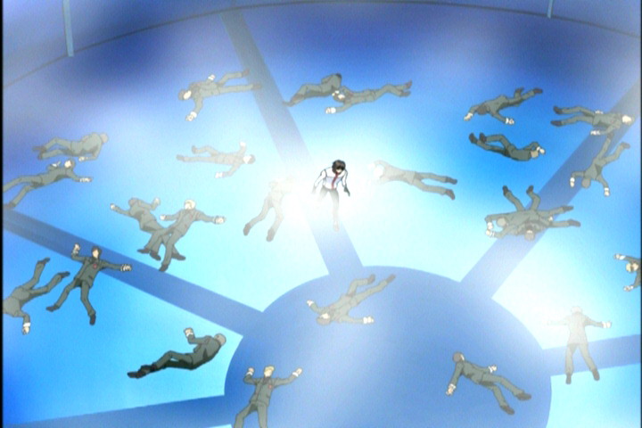 Сиэль кричит. Четырежды стреляет Ёдзи по ногам. Ёдзи прыгает. Пятый выстрел. Ёдзи приземляется за спиной Сиэль, Сиэль опутана проволокой.