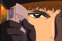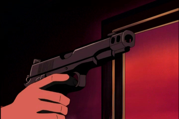 Трижды стреляет в Ёдзи, промахивается. Ёдзи стоит спокойно, значит, это дамочка мажет. Следует традиции вайссовских секретарш?